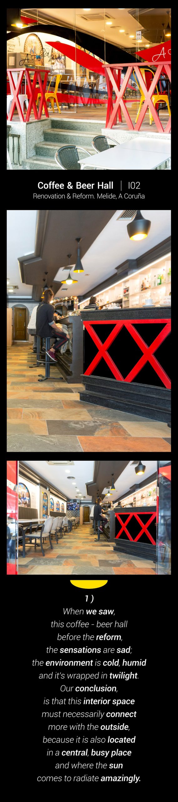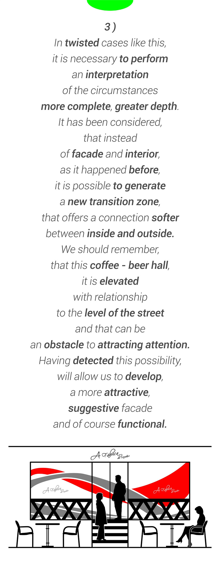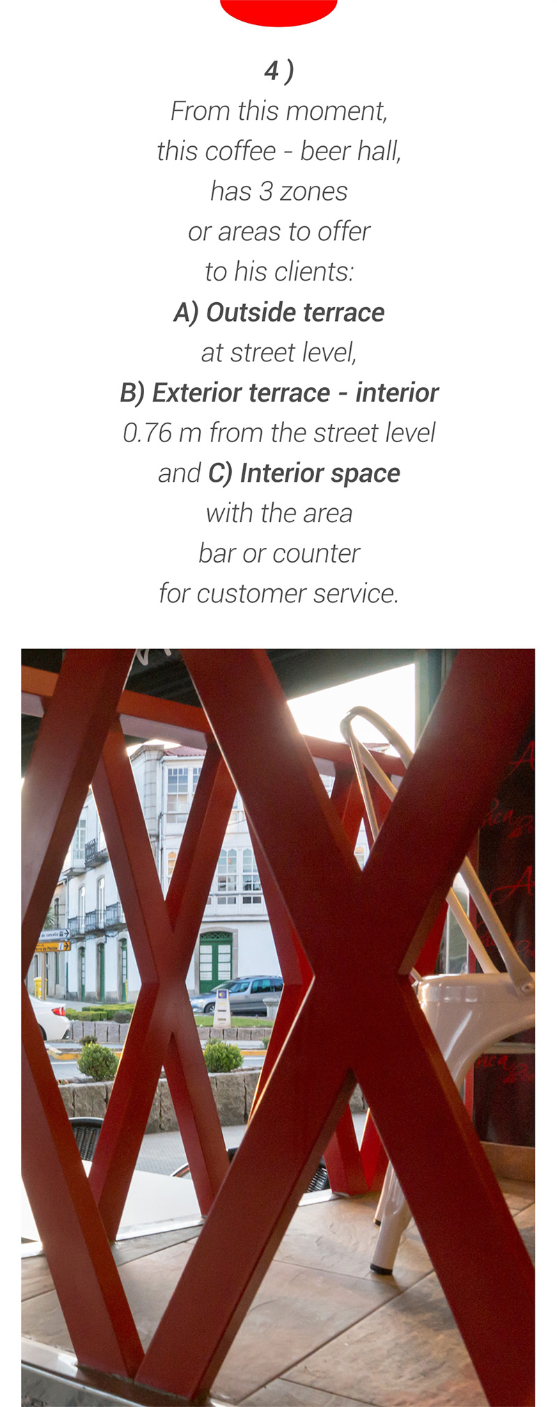 In twisted cases like this, it is necessary to perform an interpretation of the circumstances more complete, greater depth. It has been considered, that instead of facade and interior, as it happened before, it is possible to generate a new transition zone, that offers a connection softer between inside and outside. We should remember, that this coffee & beer hall, it is elevated with relationship to the level of the street and that can be an obstacle to attracting attention. Having detected this possibility, will allow us to develop, a more attractive, suggestive facade and of course functional.