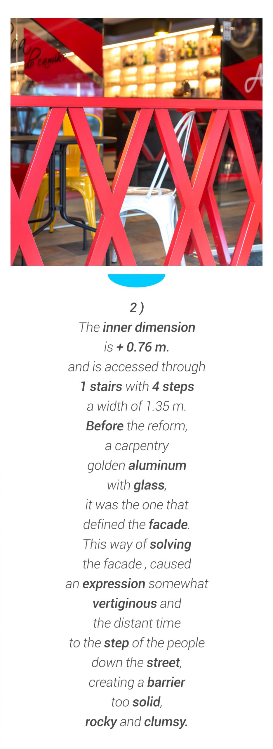 The inner dimensionis + 0.76 m. and is accessed through 1 stairs with 4 steps a width of 1.35 m. Before the reform, a carpentry golden aluminum with glass, it was the one that defined the facade. This way of solving the facade , caused an expression somewhat vertiginous and the distant time to the step of the people down the street, creating a barrier too solid, rocky and clumsy.