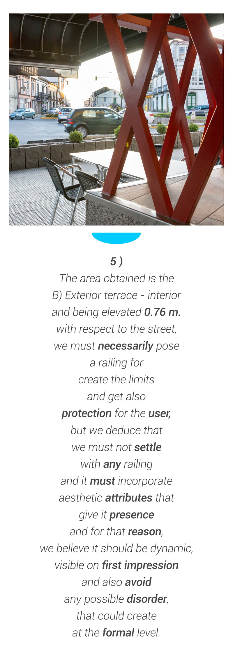 The area obtained is the B) Exterior terrace – interior and being elevated 0.76 m. with respect to the street, we must necessarily pose a railing for create the limits and get also protection for the user, but we deduce that we must not settle with any railing and it must incorporate aesthetic attributes that give it presence and for that reason, we believe it should be dynamic, visible on first impression and also avoid any possible disorder, that could create at the formal level.