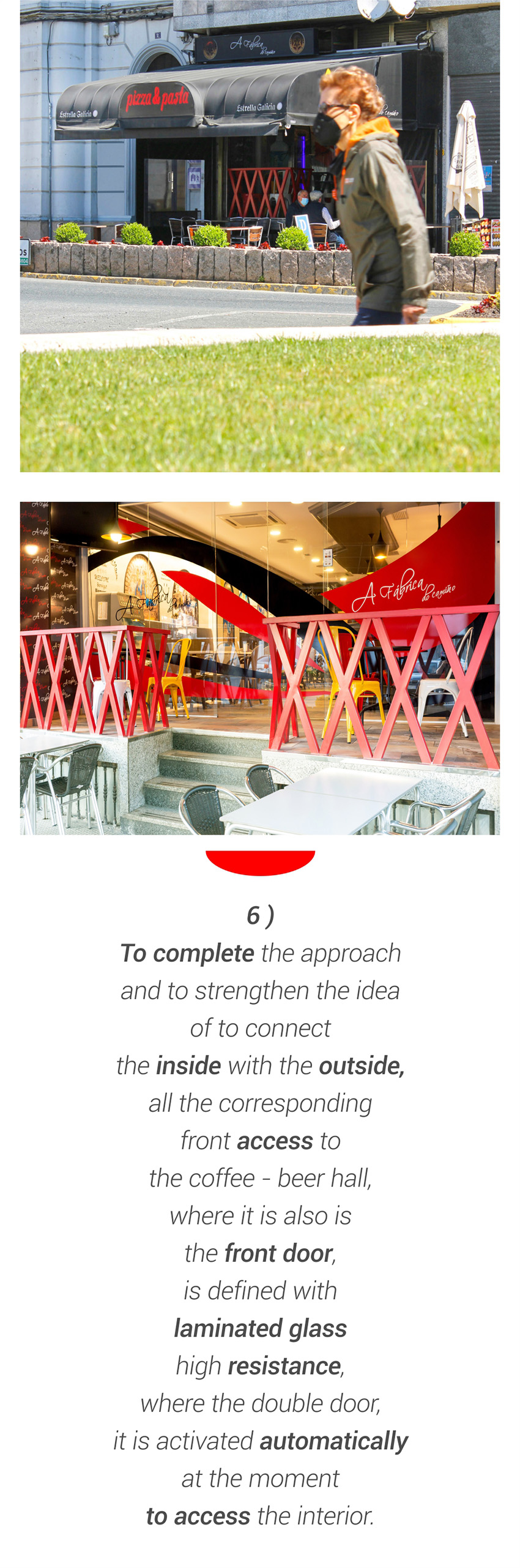 To complete the approach and to strengthen the idea of to connect the inside with the outside, all the corresponding front access to the coffee – beer hall, where it is also is the front door, is defined with laminated glass high resistance, where the double door, it is activated automatically at the moment to access the interior.