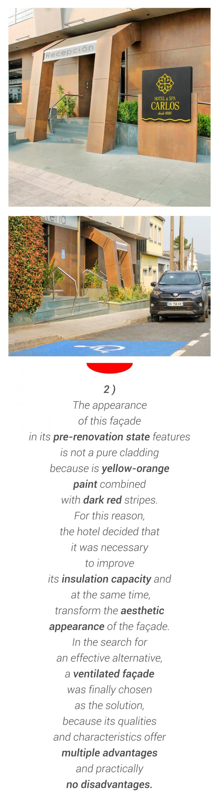 The appearance of this façade in it´s pre-renovation state features is not a pure cladding because is yellow-orange paint combined with dark red stripes. For this reason, the hotel decided that it was necessary to improve its insulation capacity and at the same time, transform the aesthetic appearance of the façade. In the search for an effective alternative, a ventilated façade was finally chosen as the solution, because its qualities and characteristics offer multiple advantages and practically no disadvantages.