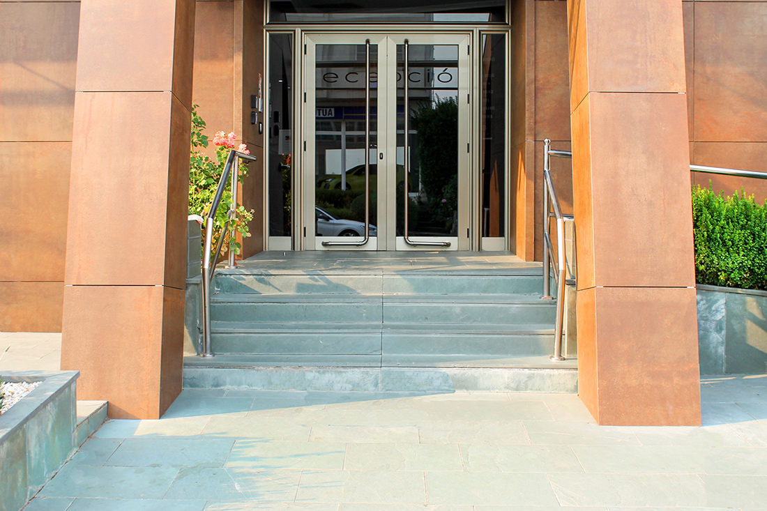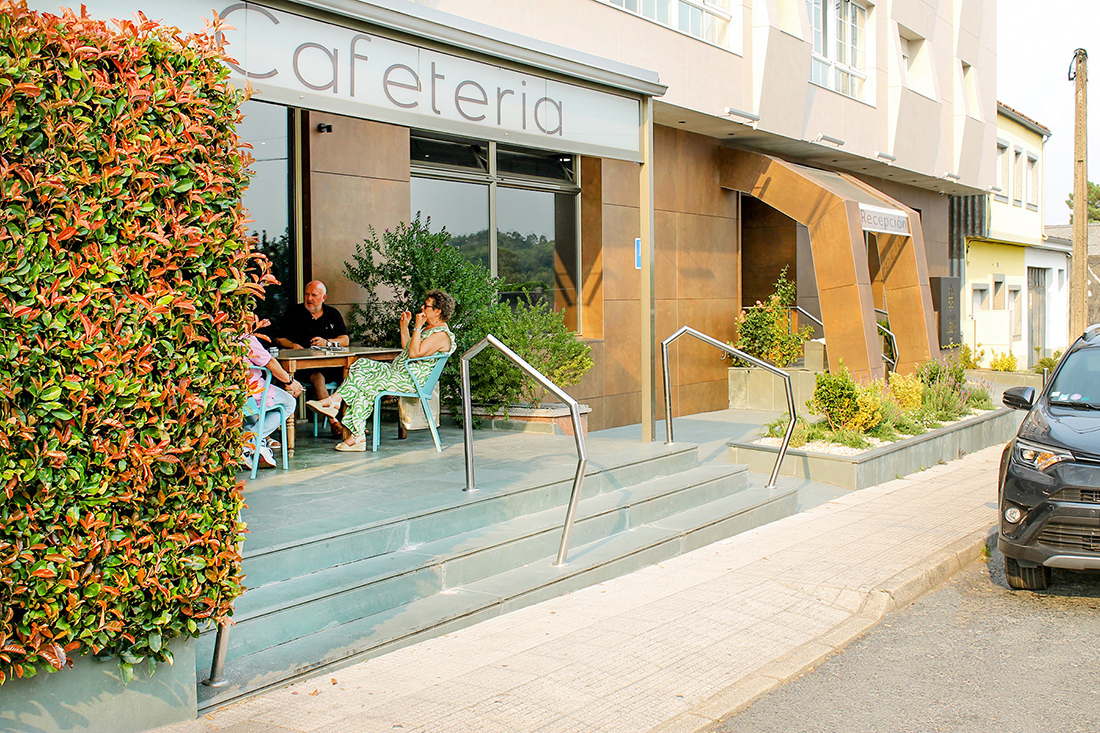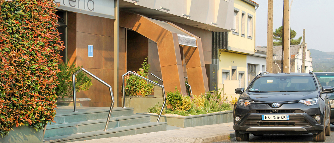 Another essential detail to complete this composition is the entrance, which leads directly to the recpection desk or the guest´s first point of contact with the hotel. Due to the importance of the message conveyed by this circumstance, we were able to create a unique element made with a independent structure of two articulated semi-porchs, located on either side of the existing exterior staircase. These two semi-porchs, located are connected by a glass roof and thanks to this way of define the access, we were able to design a refined architectural element, thus creating a more protected, framed and bold entrance, as it has been integrated into this area, making it seem as if it had always been there.