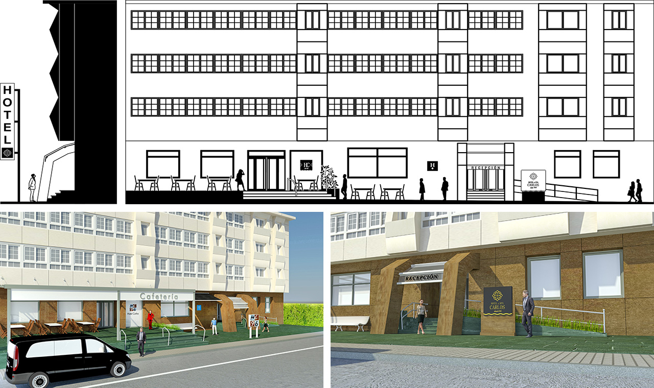 Working in perfect harmony with the owners of this hotel, founded in 1996, we have had the opportunity to undertake various improvement projects to address the renovation of 6 areas of this facility, several are still underway and others are already completed, such as this façade, whose 38 m. length gives it considerable scope and dimensions.