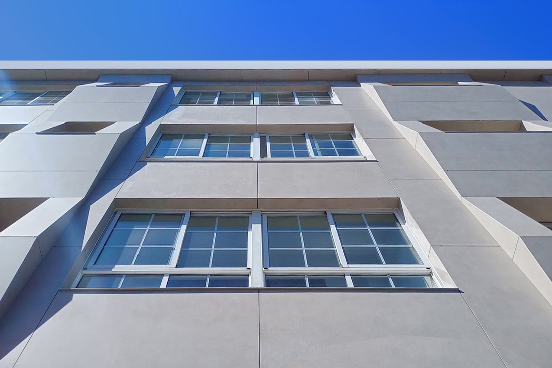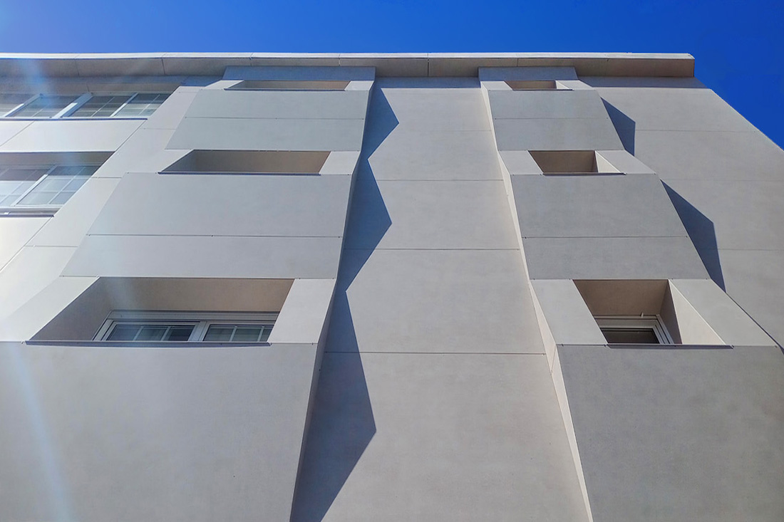 The cladding used on tjis new façade is a large format porcelain tile and this quality of this material facilitates a well organized breakdown. It is made up of pieces measuring between 3 and 1 m. And as the final part or outer layer of this construction system, it is anchores to battens that have previously been fixed to the building, thus helping to create an air chamber, which shares space with exterior rock wool insulation and together, these two parts perfom a formidable job in achieving a high level of insulation.