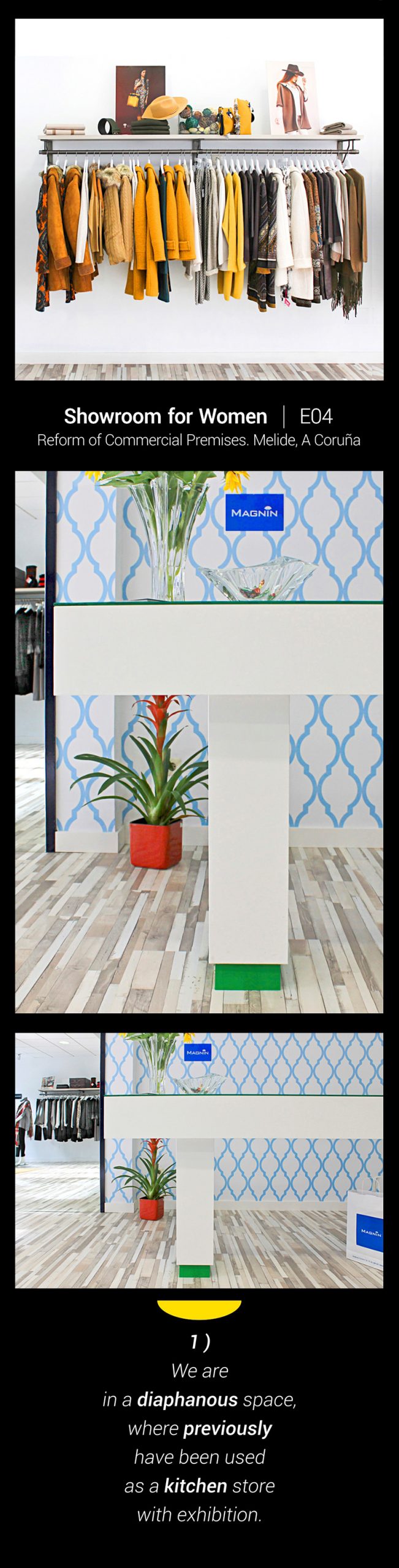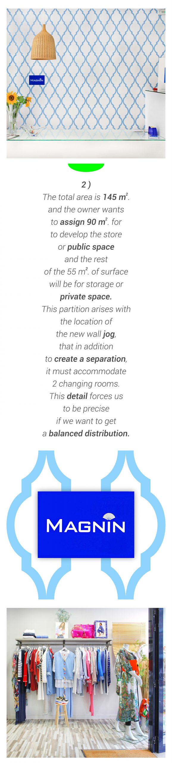Diaphanous space that previously have been used as a kitchen store with exhibition. The total area is 145 m² . and the owner wants to assign 90 m² . for to develop the store or public space and the rest of the 55 m² . of surface will be for storage or private space. This partition arises with the location of the new wall, that in addition to create a separation, it must accommodate 2 changing rooms. This detail forces us to be precise if we want to get a balanced distribution.