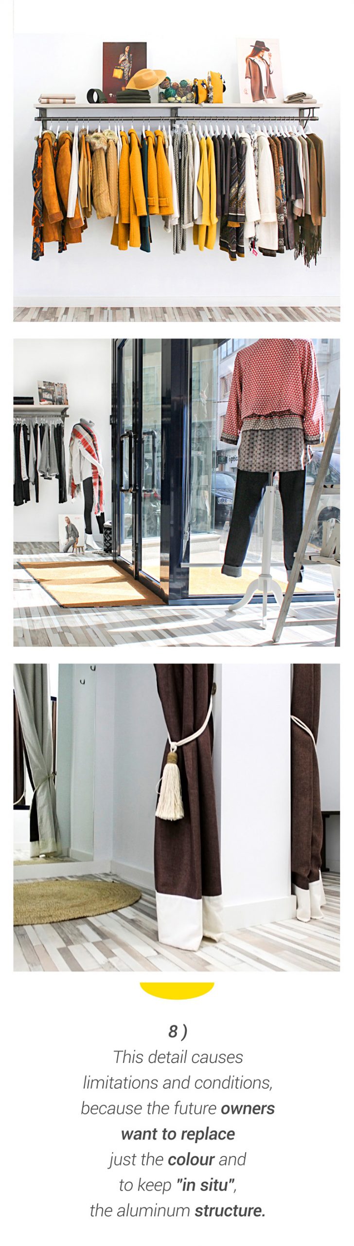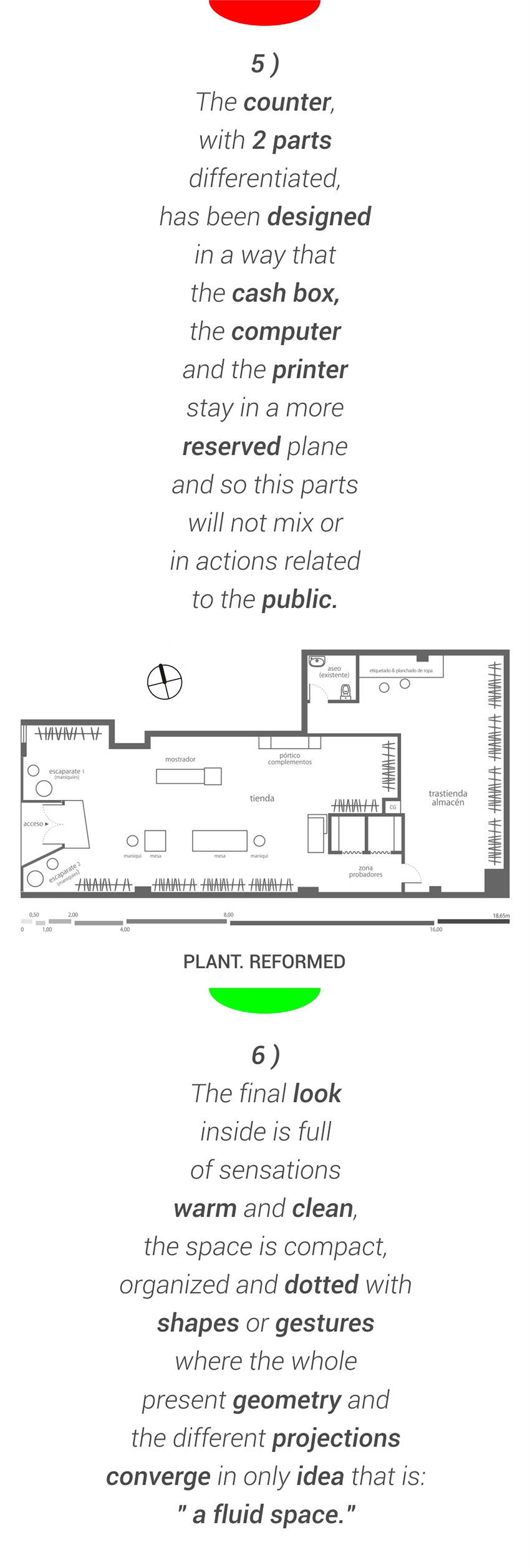 The definitive configuration, is the result to analyze with attention the different derivative actions in the use of this future new space and that’s why it has been taken in consideration several aspects for example; to get intimacy for the changing rooms, to avoid coincidences or traffic jams in circulation (private – public), proper zoning and clearly defined. We believe in the importance of coordinating these formal details well, since it will guide us with criteria towards a good organization of all the parts that make up the showroom.