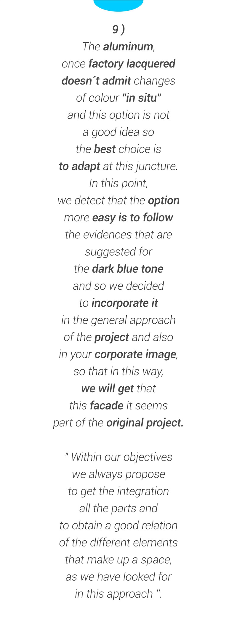 The aluminum, once factory lacquered doesn´t admit changes of colour “in situ” and this option is not a good idea so the best choice is to adapt at this juncture. In this point, we detect that the option more easy is to follow the evidences that are suggested for the dark blue tone and so we decided to incorporate it in the general approach of the project and also in your corporate image, so that in this way, we will get that this facade it seems part of the original project.