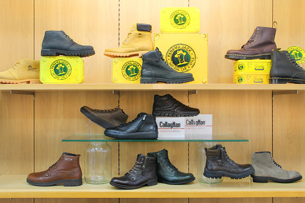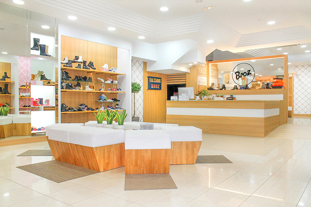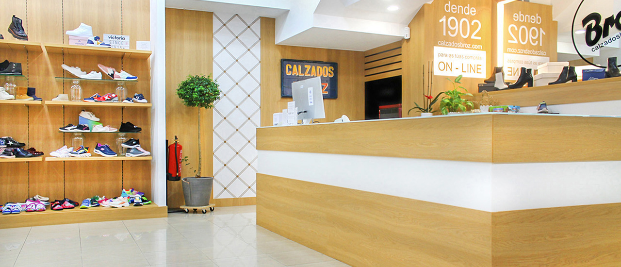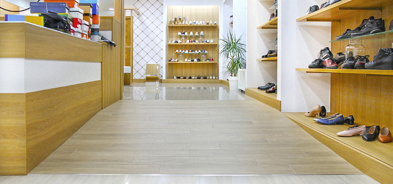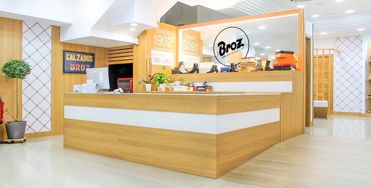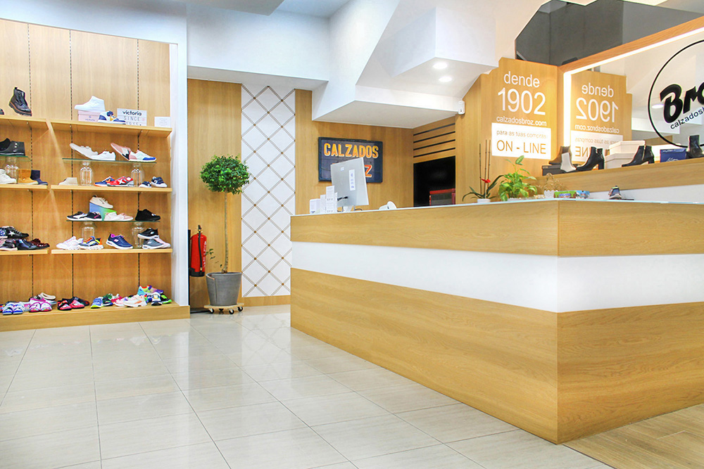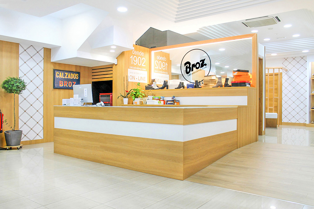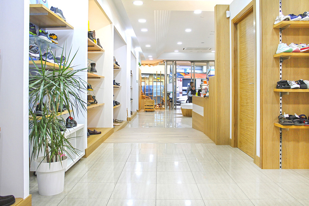 El mostrador y su fondo realizado con un tabique, nos trae una buena noticia, porque nos ayuda a ocultar el lateral de la escalera. Este fondo, define la zona e incorpora varias funciones en si mismo: 1) Superficie de exposición en zona de mostrador. 2) Alojamiento para un espejo de 3,00 m. x 1,60 m., donde hemos ubicado la imagen corporativa de esta zapatería, fundada en el año 1902 y lo hemos hecho mediante un vinilo adhesivo fijado en un espejo, donde el efecto logotipo – espejo es realmente elegante y se ha hecho así porque en el planteamiento era un objetivo crear la situación idónea y disponer de la circunstancias adecuadas para fijar en un espejo la imagen corporativa.