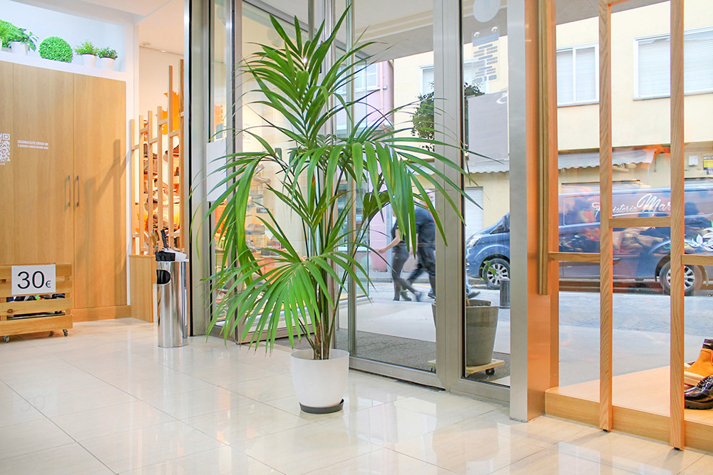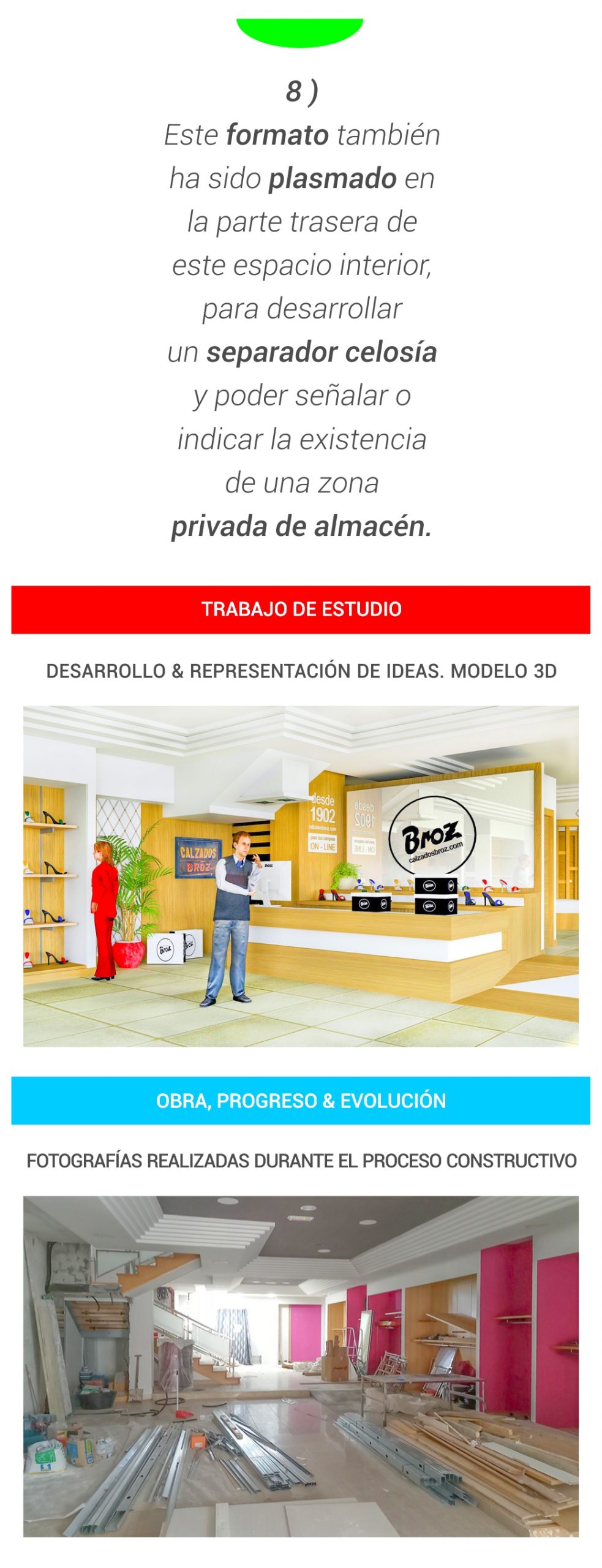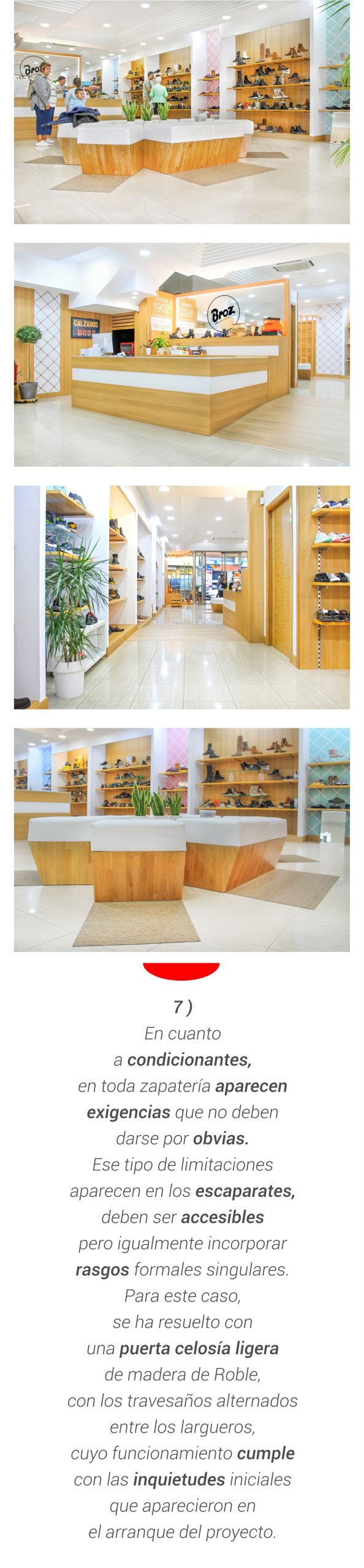 En cuanto a condicionantes, decir que, en toda zapatería aparecen exigencias que no deben darse por obvias. Ese tipo de limitaciones aparecen en los escaparates, deben ser accesibles pero igualmente incorporar rasgos formales singulares. Para este caso, se ha resuelto con una puerta celosía ligera de madera de Roble, con los travesaños alternados entre los largueros, cuyo funcionamiento cumple con las inquietudes iniciales que aparecieron en el arranque del proyecto. Este formato también ha sido plasmado en la parte trasera de este espacio interior, para desarrollar un separador celosía y poder señalar o indicar la existencia de una zona privada de almacén.