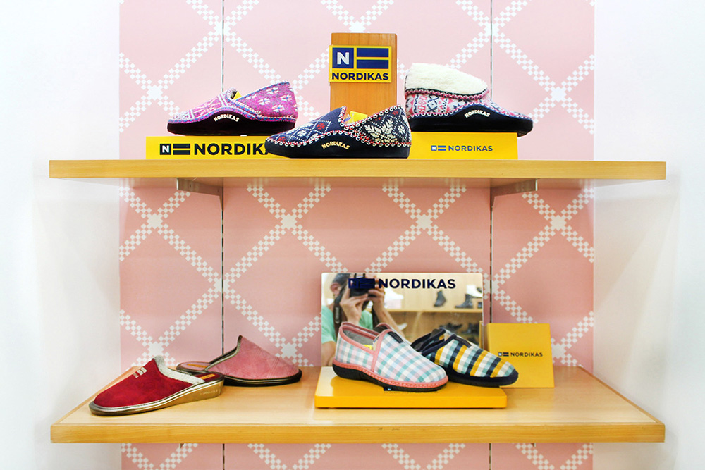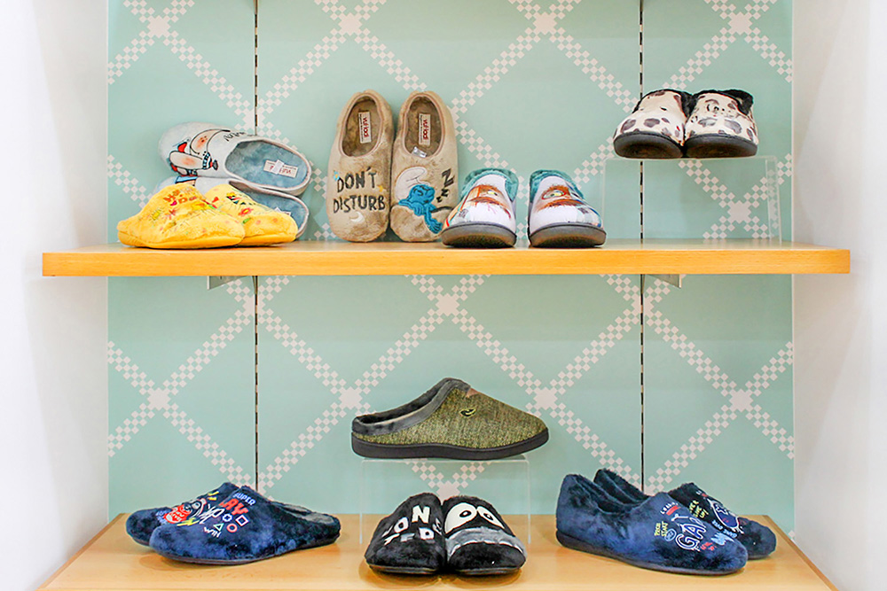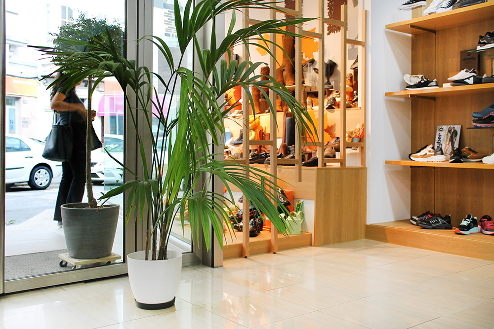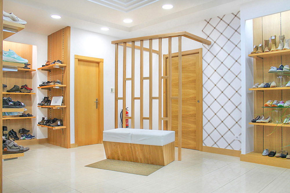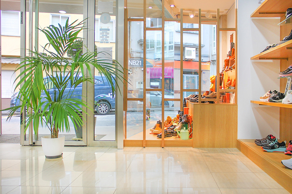 En cuanto a condicionantes, decir que, en toda zapatería aparecen exigencias que no deben darse por obvias. Ese tipo de limitaciones aparecen en los escaparates, deben ser accesibles pero igualmente incorporar rasgos formales singulares. Para este caso, se ha resuelto con una puerta celosía ligera de madera de Roble, con los travesaños alternados entre los largueros, cuyo funcionamiento cumple con las inquietudes iniciales que aparecieron en el arranque del proyecto. Este formato también ha sido plasmado en la parte trasera de este espacio interior, para desarrollar un separador celosía y poder señalar o indicar la existencia de una zona privada de almacén.