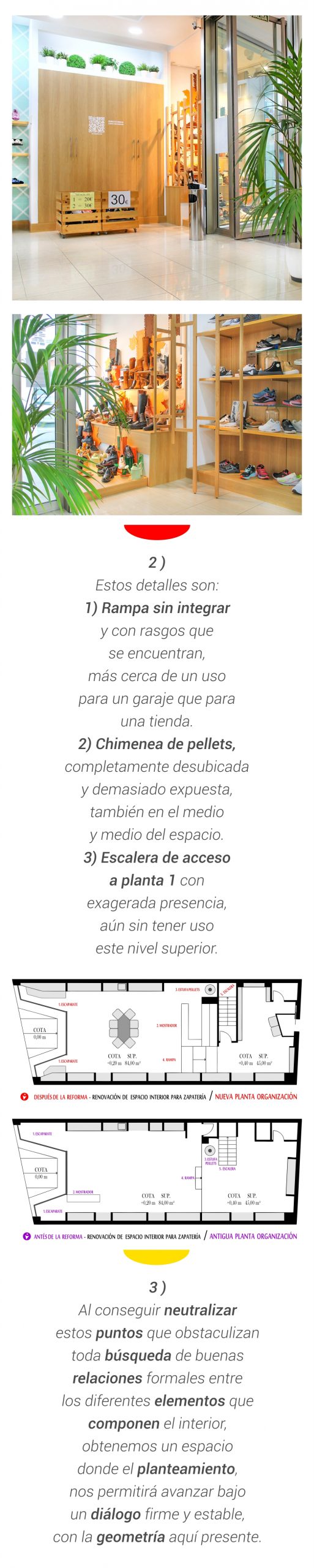 Cuando realizamos la primera toma de contacto en este espacio interior de 129 m2, la información que nos proporciona es altamente hostil por la existencia de ciertos detalles que nos obligan a reaccionar con mucha atención, para que este trabajo, pueda empezar y terminar con éxito, bajo control y por supuesto, alejándose de las malas prácticas a las que este bajo comercial, estaba sometido. Estos detalles son: 1) Rampa sin integrar y con rasgos que se encuentran, más cerca de un uso para un garaje que para una tienda. 2) Chimenea de pellets, completamente desubicada y demasiado expuesta, también en el medio y medio del espacio. 3) Escalera de acceso a planta 1 con exagerada presencia, aún sin tener uso este nivel superior.
