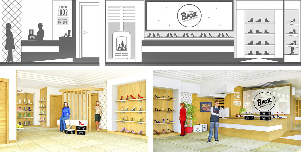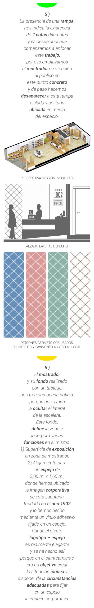 1/ Sección Transversal y Alzado Lateral Derecho. 2/ Escenas Virtuales, Modelo 3D. Renovación & Reforma de Local para Zapatería en Melide, A Coruña